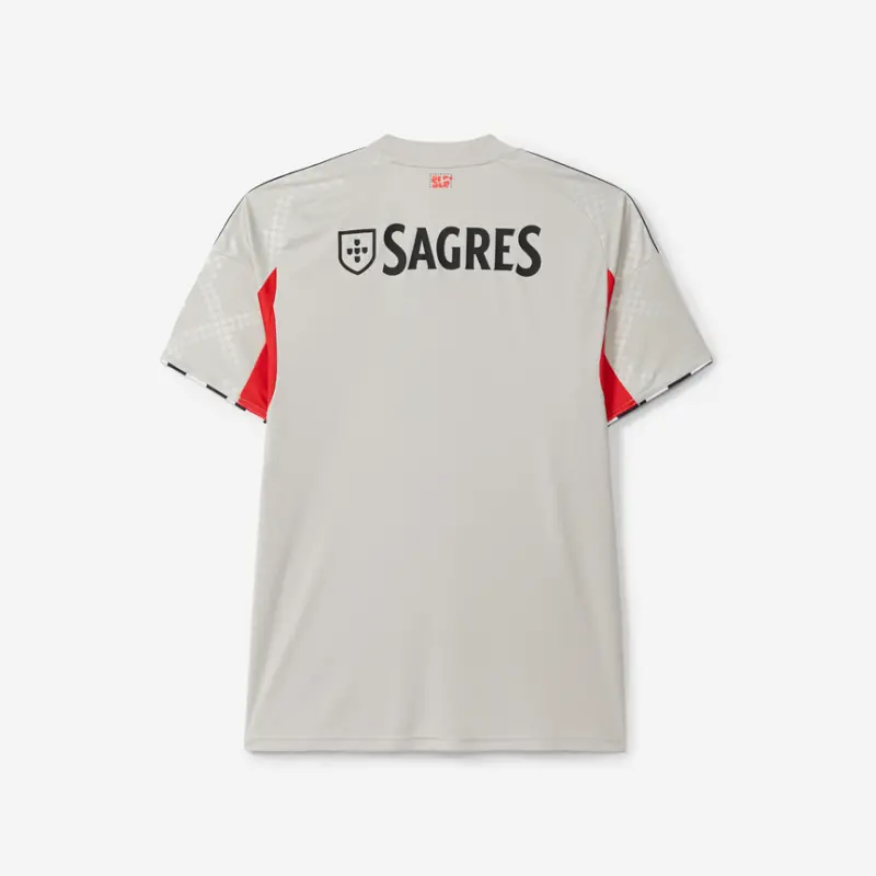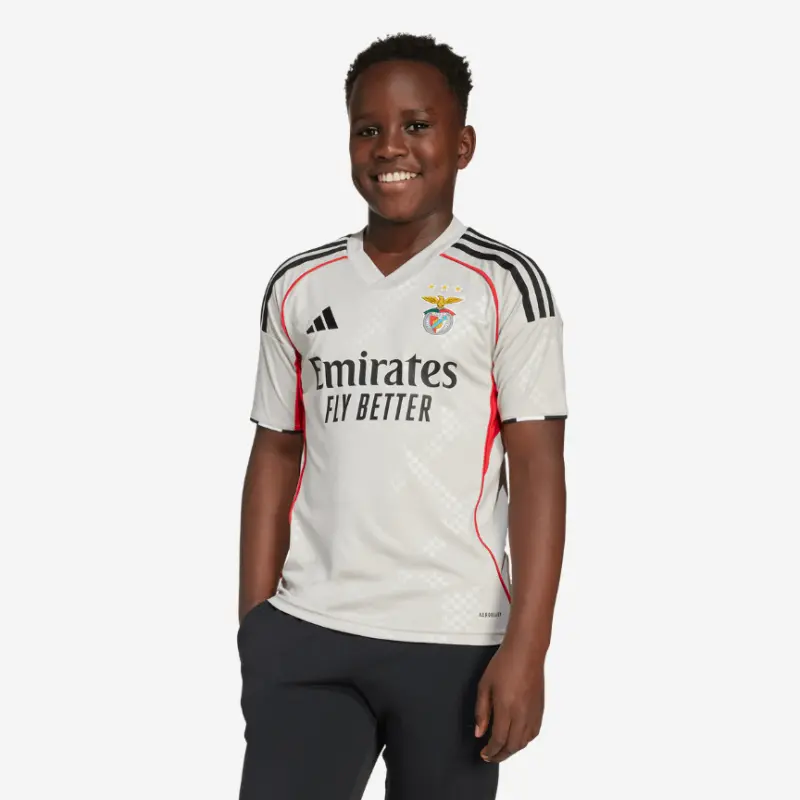 Match the SL Benfica 2025-2026 Beige Away Jersey for Kids with other SL Benfica equipment and show your love for the Glorioso during games with your friends!