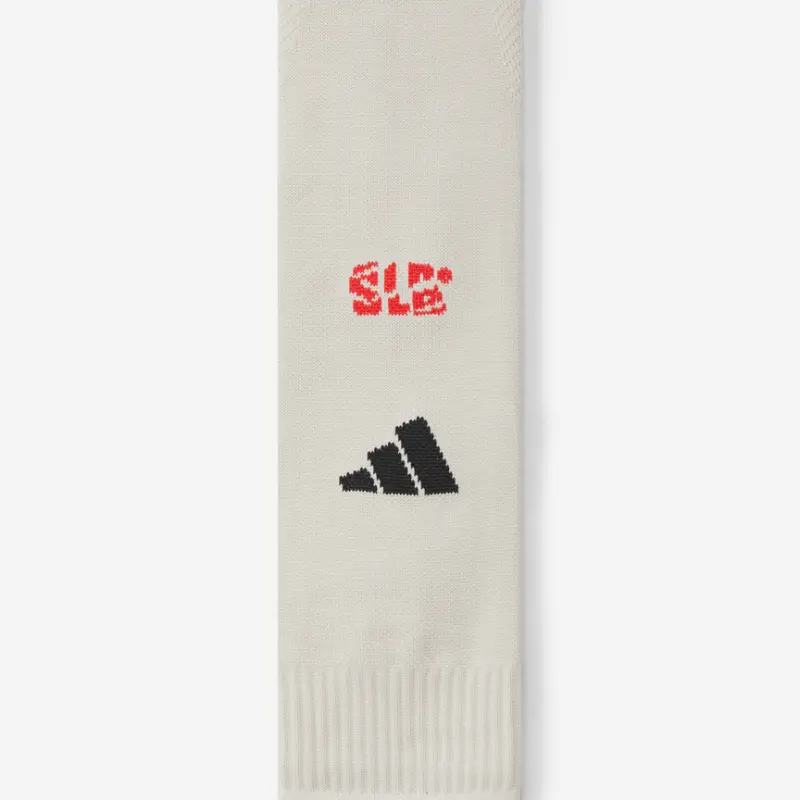 Na frente, temos o logo da Adidas em preto e a inscrição “SLB”, a vermelho.