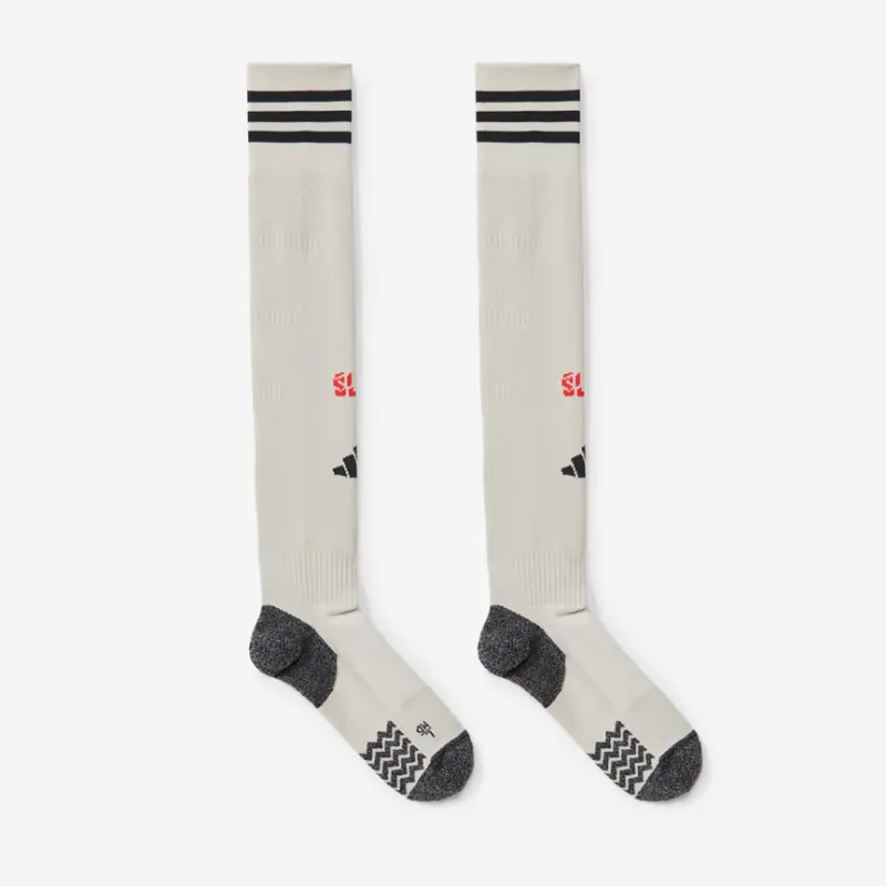 Meias beges, com pormenores pretos, do equipamento alternativo do Sport Lisboa e Benfica, utilizadas pela equipa durante a época de 2025-2026.