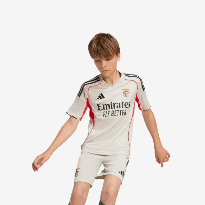Beige away kit of Sport Lisboa e Benfica, worn by the team during the 2025-2026 season, for kids.
