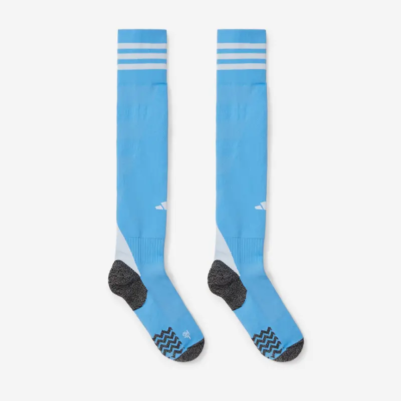 Adidas’ iconic stripes and logo appear on the sock cuffs.