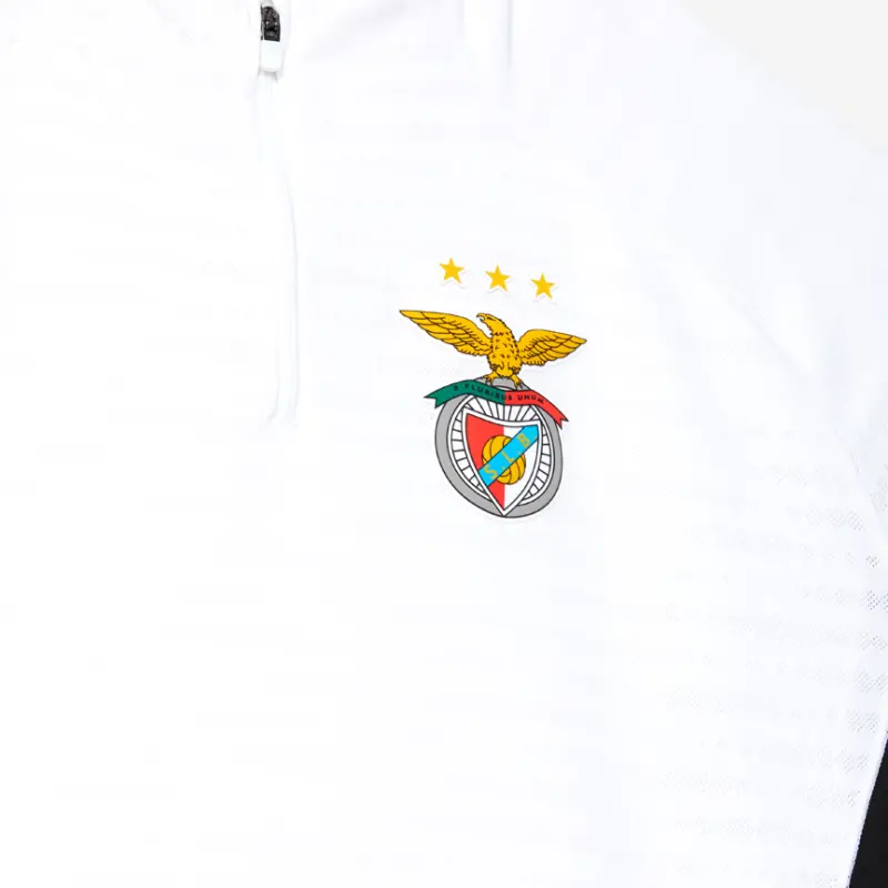 Sobre o lado esquerdo do peito, aplicação do emblema do Sport Lisboa e Benfica.