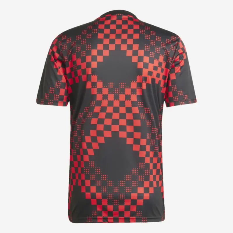 Black Adidas shirt with a red pattern, worn by the Sport Lisboa e Benfica team during the 2025-2026 season, in the pre-match warm-up period.