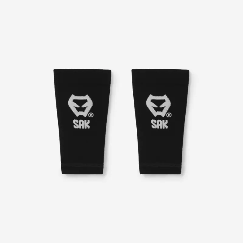 The package consists of the shin pads and two black leggings with the SAK symbol in white, to hold the shin pads on the leg.